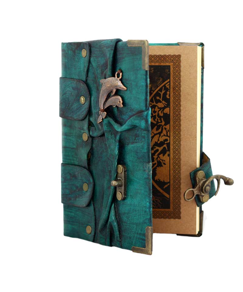 Unique handmade belted leather bound journal with a Double Dolphin Pendant on the front cover. This great piece of art is combined with a Journal which can also be used as a notebook and diary. The paper used in the Journal is top quality Persian Paper and can be used for both sketching and writing.
