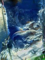 In this natural stone piece, it is as if nature has created a sprawling landscape of a marine habitat on a single piece of stone. The background of the imagery is a rich, deep, midnight blue color with little specks of white that one might see when viewing a deep sea environment. Dusty white “sand” is present on the bottom of the image with shadows on it that might serve as the shadows of sharks and other creatures swimming. Toward the top right are creatures that even look like sharks complete with fins gliding through the water. You can choose from a variety of different mediums in which to bring home this authentic art piece.