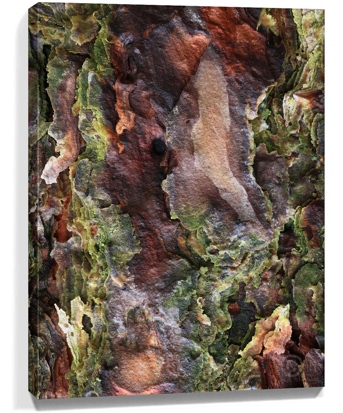 The effortless blending of colors is one of the wonders of nature. Whereas artists have to carefully choose the colors and place them just so to be sure they fade into one another easily. Mother Nature needs no such forethought when painting her canvas, and that is clear when looking at this art image. This up close look at a tree depicts various shades of browns, rich reds, vibrant orange and lush greens all working hand in hand to create a beautiful flow of colors. The smooth nature of the bark itself even brings to mind a perfectly flat canvas.